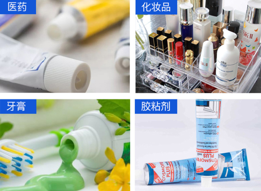 Tubes multicouches laminés (laminés plastique/feuille d'aluminium), tubes en aluminium et tubes en plastique. Les machines sont souvent équipées de mâchoires de scellage différentes selon les matériaux.