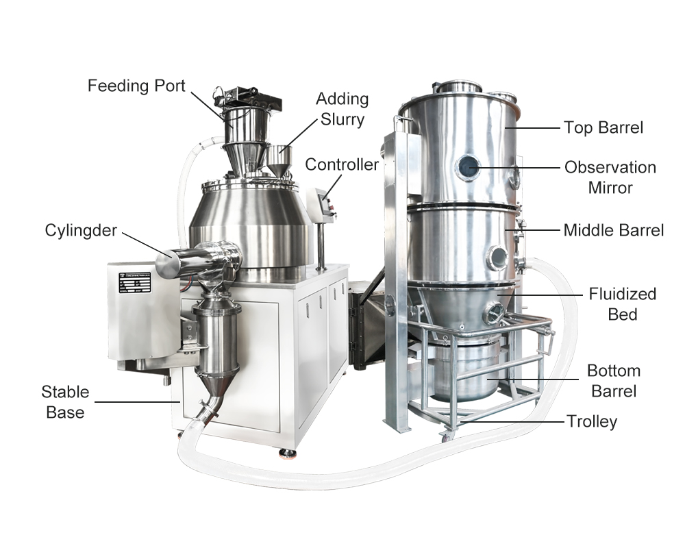 3. 本装置は、造粒、コーティング、ペレット化、乾燥の機能を統合しています。 モジュール式コンポーネントを交換することで、プロセス全体を 1 つのユニット内で完了できます。 効率を高め、相互汚染を防ぐために、密閉型の負圧供給システムがサポートされています。